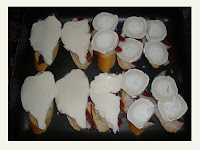 Los metemos al horno en una bandeja unos 10 min. Se trata más de que el hojaldre tome algo de temperatura y se ponga crujiente y que el relleno se caliente y funda un poco.