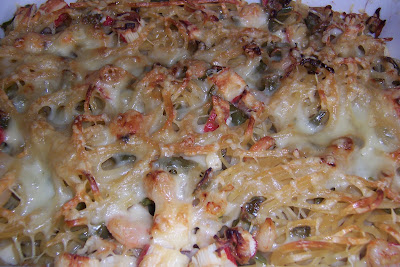 Luego se añade este sofrito a los tallarines (ya escurridos y en la bandeja para horno) y le ponemos por encima queso rallado para gratinar.